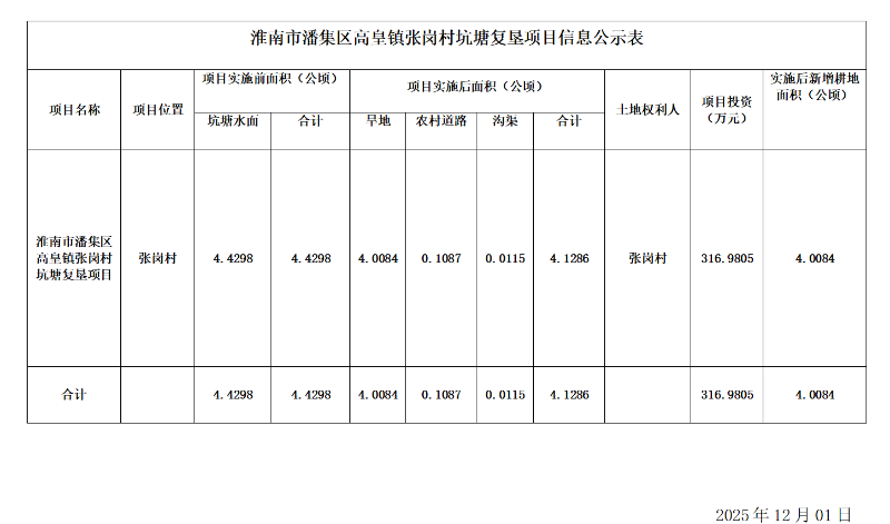 淮南市潘集区高皇镇张岗村坑塘复垦项目,位于高皇镇张岗村境内,项目总规模为4.4298公顷,复垦后新增耕地面积4.0084公顷。