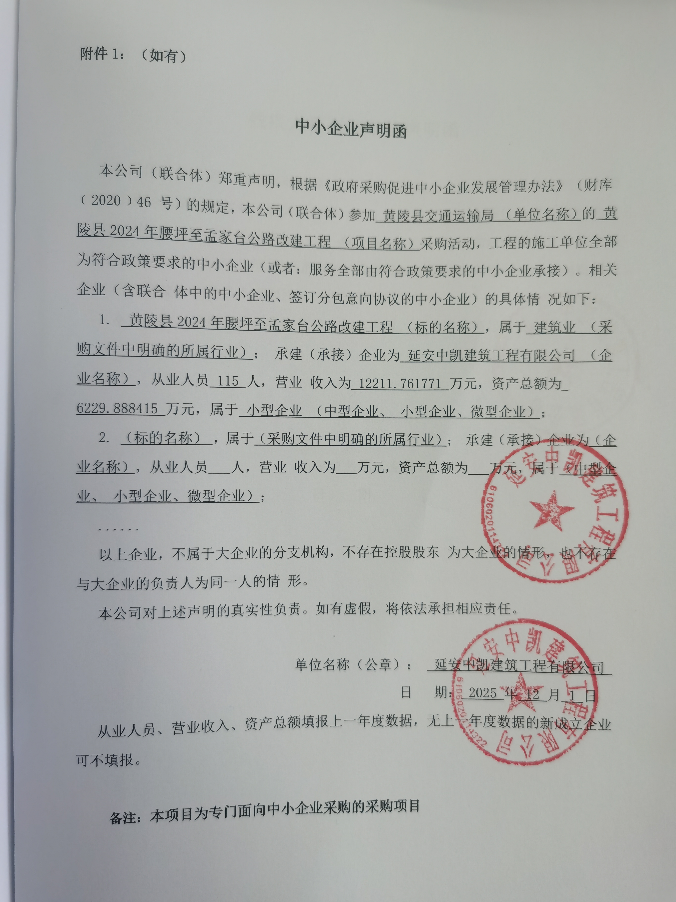 黄陵县交通运输局黄陵县2024年腰坪至孟家台公路改建工程中标(成交)明细.pdf 招标文件(黄陵县2024年腰坪至孟家台公路改建工程)定稿.pdf 中小企业声明.jpg