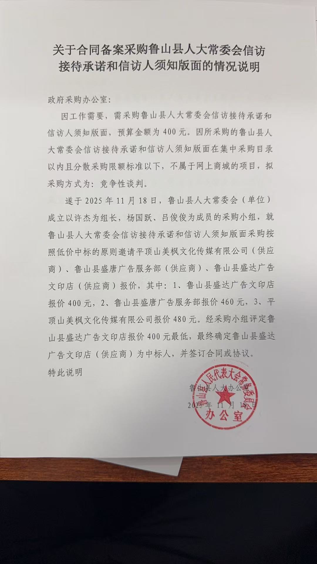 | 二、合同名称:鲁山县人大常委会采购信访接待承诺和信访人须知版面 | ||||||||||||