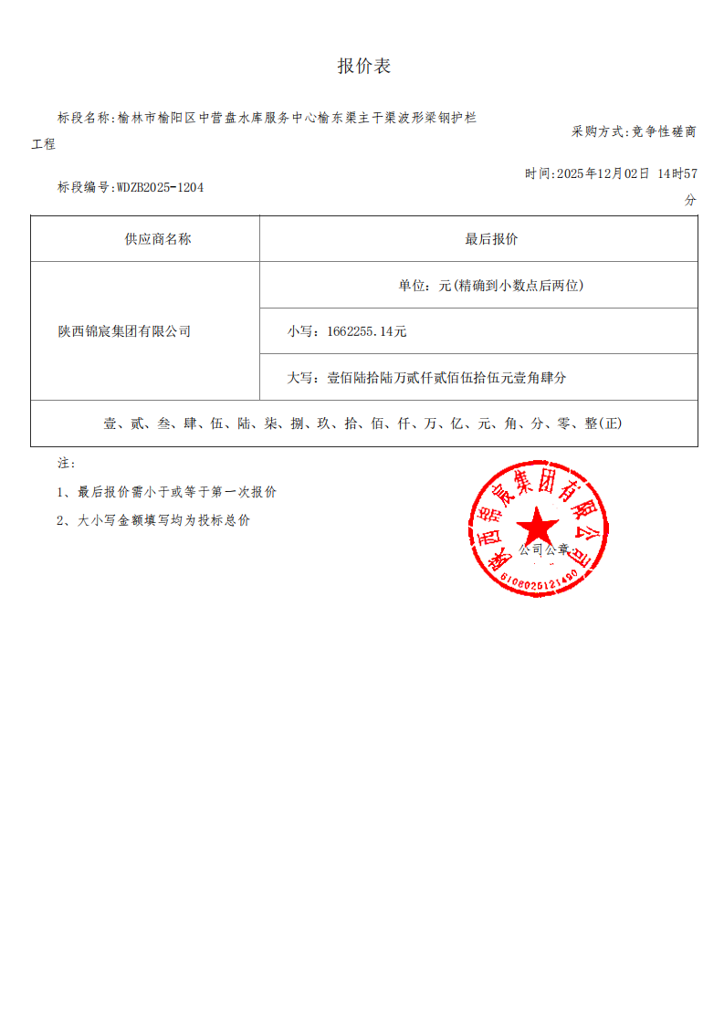 | 1 | 其他水利工程施工 | 波形梁钢护栏工程 | 满足竞争性磋商文件要求 | 合同签订后60个日历天内交付验收 | 李丹 | 陕******2072 | 1,662,255.14 |